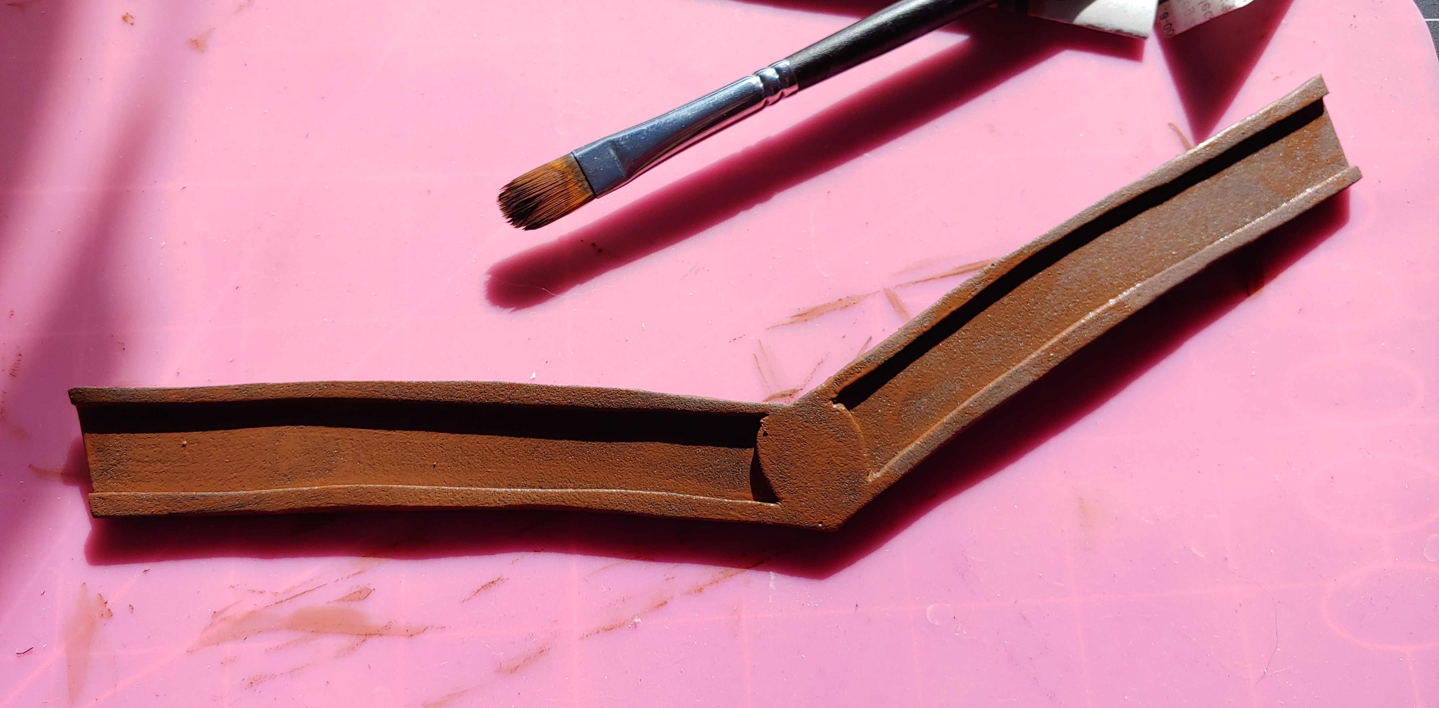 The primer I used was black, and gold paints tend to have poor coverage, so a trick I like to use to save on expensive metallic paints is to do a base coat with a cheaper paint in a close colour. In this instance, I picked a cinnamon brown acrylic paint that I got at the dollar store. It will help the metallic paint appear to cover in fewer coats and give the final finish just a little more depth. Next the whole thing got a couple coats of gold paint, and in spots that I wanted to have a little bit of shading, I mixed the same brown together with my gold. Once you’re happy with the paint job, give it enough time to dry fully and then put a top-coat like mod podge on to protect it.