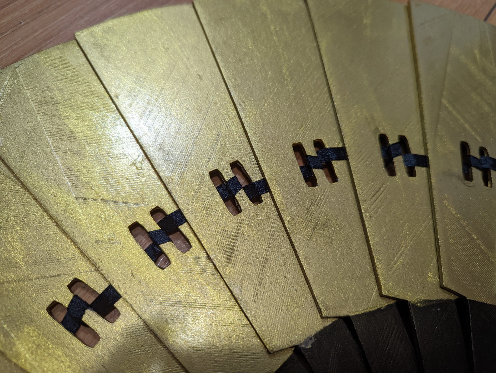 Finally, after almost 2 weeks, we got to put them all together! So first I grabbed those chicago screws and stacked all my blades for the first fan onto one of them, and screwed on the cap. We were lucky that our stack of blades was just the right height for our screw, but we were prepared to cut the screw shorter with a hack saw if it was too long. Next, I got out my ribbon and some more of that quick dry super glue and figured out a wrapping pattern that would allow the blades to open and close fully. I’ll show a close-up of what that looked like, you don’t have to do it the same, but there are a few important things that will ensure they have full motion. The first is, that when the ribbon runs from one blade to the next, it should sandwich between the two blades, if it goes around the outside of either blade, the fan will either not shut the whole way, or have big gaps when it’s open.