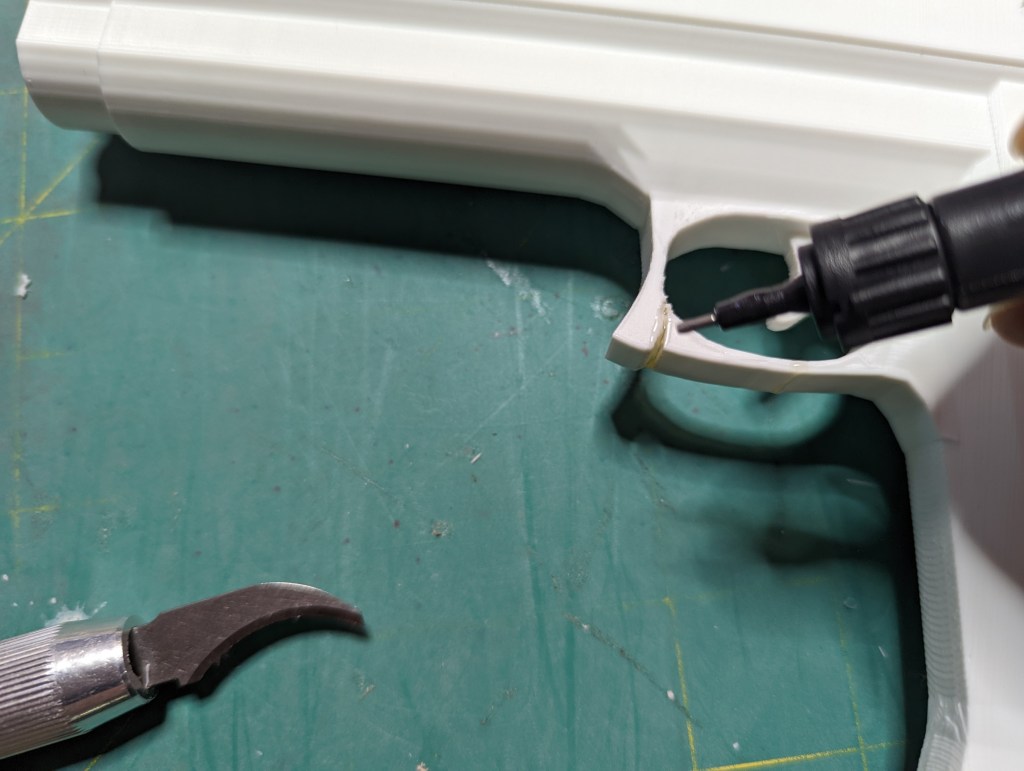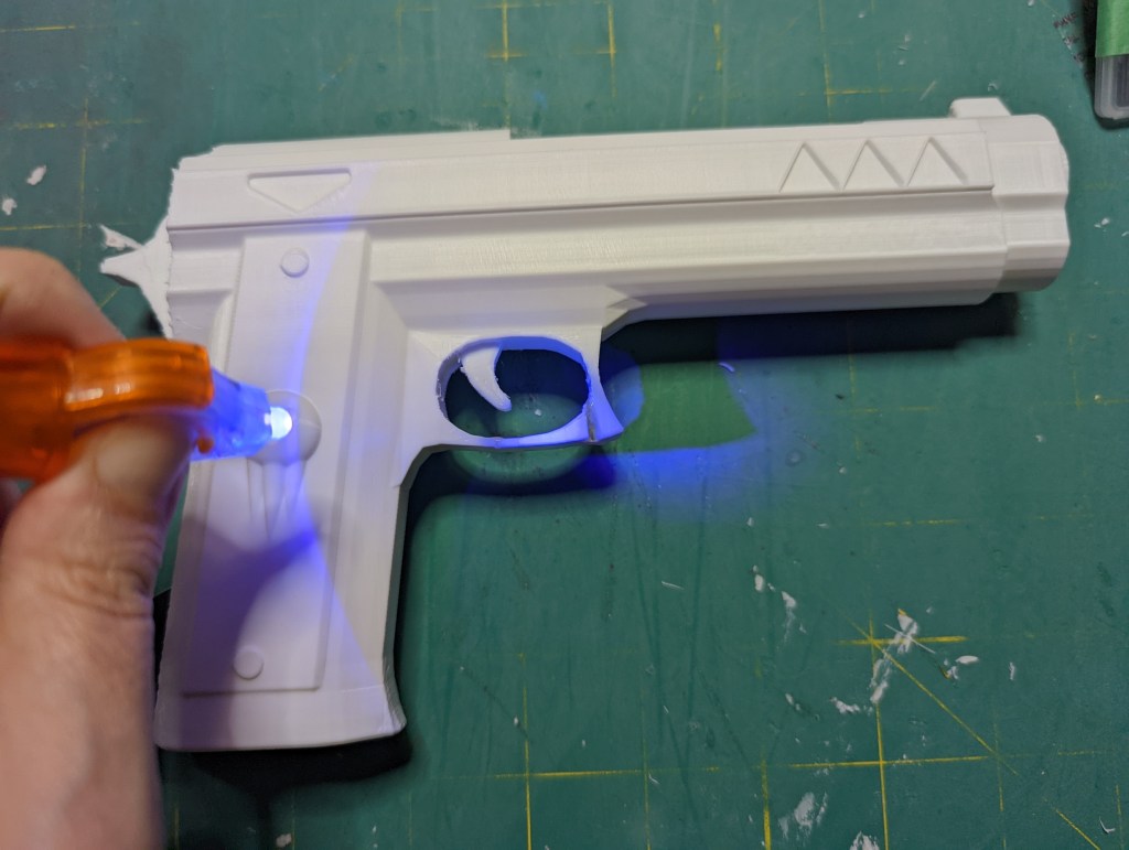 This is where the cool part comes in, I used to repair them with a construction glue called PL Premium, great stuff, but it takes 24 hours to dry. In the spring my husband was browsing at the hardware store and found a UV resin pen. I’m sure there are cheaper ways to purchase UV resin, but he grabbed it because he thought it would be a good beginner-friendly way to play with some UV resin for the first time. A month or two later I had the idea to try it out on this pistol repair that I do all the time.